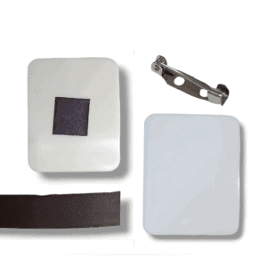 – Cada pin está fabricado en plástico blanco sublimable, resistente al calor y fácil de trabajar. Incluye base metálica tipo prendedor de gancho, lista para ser adherida con pegamento después del estampado.